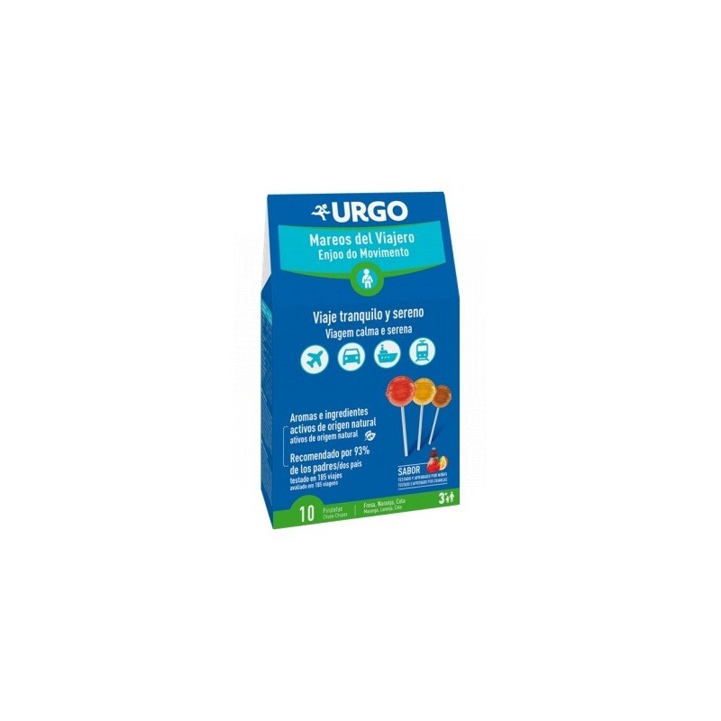 SU FORMATO EN PIRULETA ES DIVERTIDO Y PERMITE TANTO A LOS MÁS PEQUEÑOS COMO MAYORES, LLEVÁRSELO A TODAS PARTES.SU FÓRMULA EXCLUSIVA COMBINA DOS EXTRACTOS PLANTAS DE RECONOCIDA ACCIÓN:– EL JENGIBRE, QUE CONTRIBUYE AL BIENESTAR DURANTE LOS VIAJES– DIENTE DE LEÓN, QUE FAVORECE LA BUENA DIGESTIÓNNO PROVOCA SOMNOLENCIA*UN ESTUDIO REALIZADO SOBRE 58 NIÑOS QUE SUFREN MAREOS POR VIAJES DE FORMA HABITUAL, HA DEMOSTRADO QUE :EL 93% DE LOS ADULTOS RECOMIENDA URGO MAREOS DEL VIAJEROEL 88% DE LOS PADRES CONSIDERA QUE EL BIENESTAR DIGESTIVO DE SU HIJO HA MEJORADO.8 DE CADA 10 NIÑOS ESTÁN SATISFECHOS DESDE EL PRIMER VIAJE.MODO DE EMPLEO:SE DEBE TOMAR ENTRE 30 MINUTOS Y 1 HORA ANTES DEL INICIO DEL VIAJE.PARA UN TRAYECTO LARGO, SE PUEDE TOMAR HASTA 3 VECES LA DÍA.URGO MAREOS DEL VIAJERO SE PUEDE TOMAR A PARTIR DE LOS 3 AÑOS, BAJO LA SUPERVISIÓN UN ADULTO.PRECAUCIONES DE EMPLEO:MANTENER FUERA DEL ALCANCE DE LOS NIÑOS.NO DEBE UTILIZARSE COMO SUSTITUTO DE UNA DIETA VARIADA Y EQUILIBRADA Y UN ESTILO DE VIDA SALUDABLE.DEBE UTILIZARSE BAJO LA SUPERVISIÓN UN ADULTO.NO RECOMENDADO PARA LAS PERSONAS ALÉRGICAS A LAS PLANTAS DE LA FAMILIA DE LOS ZINGIBERÁCEAS O A SUS COMPUESTOS.CONSERVAR EN UN LUGAR SECO Y A UNA TEMPERATURA INFERIOR A 25°C.NO TOMAR MÁS DE 3 PIRULETAS AL DÍACOMPOSICIÓNJENGIBRE Y DIENTE DE LEÓNFORMATO10 PIRULETASSABOR FRESA, NARANJA Y COLASIN LACTOSA
