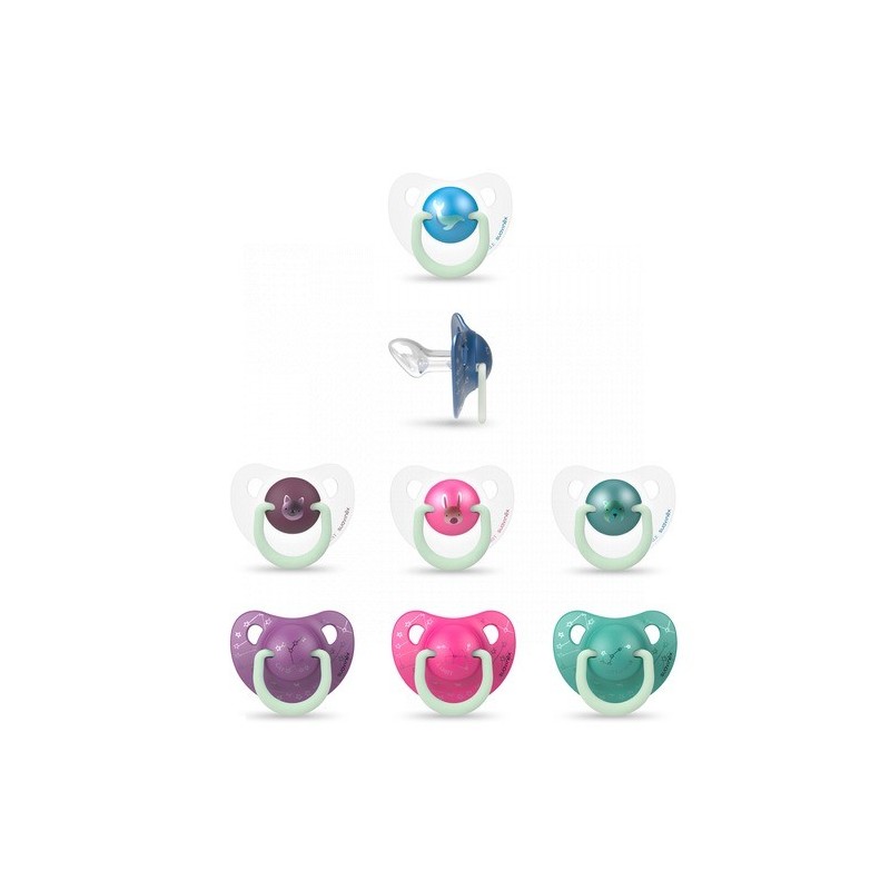 Se presentan en un pack de dos unidades, un chupete especial para el día y otro chupete para la noche. Ambos chupetes disponen de la anilla luminiscente que brilla en la oscuridad para encontrar el chupete fácilmente en la cuna del bebé si se le cae.