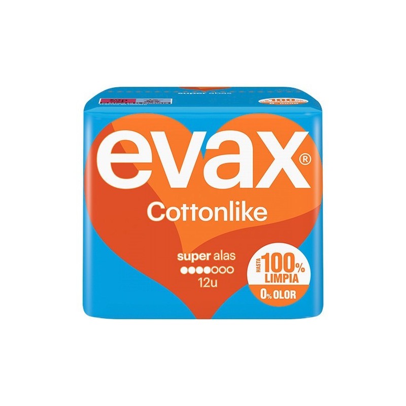 Prueba EVAX Cottonlike y no te vas a acordar de que las estás usando. Gracias al Sistema EVAX Cottonlike Dual con perlas activas que neutralizan el olor y un núcleo que captura el flujo al instante, EVAX te ofrece una absorción que te mantiene hasta 100% limpia y 0% sin rastro de olor. Sus alas mantienen la compresa en su sitio y la cobertura Cottonlike te ofrece un confort duradero.