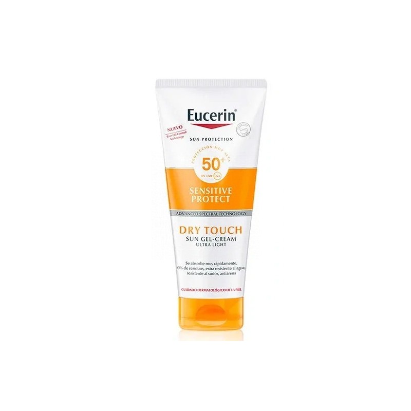 PROTECTOR SOLAR ULTRALIGERO CON TEXTURA DE GEL-CREMA QUE SE ABSORBE RÁPIDAMENTE SIN DEJAR RESIDUOS Y DEJA UN ACABADO SECO AL TACTO INMEDIATO. OFRECE UNA COMPLETA EFECTIVA Y PROTECCIÓN PARA TODO TIPO DE PIELES.EL SISTEMA ADVANCED SPECTRAL TECHNOLOGY DE EUCERIN OFRECE UNA ALTA PROTECCIÓN FRENTE A RAYOS UVA Y UVB, Y PROTECCIÓN CONTRA LA LUZ VISIBLE AZUL O HEVL. EL PROTECTOR SOLAR TAMBIÉN ESTIMULA EL MECANISMO DE REPARACIÓN DEL ADN DE LA PIEL Y SU TECNOLOGÍA OIL CONTROL, CON PARTÍCULAS MATIFICANTES, DEJA UN ACABADO SECO INMEDIATO.LA RADIACIÓN UV ES LA PRINCIPAL CAUSA DE DAÑO EN LA PIEL PROVOCADO POR EL SOL, PERO LA LUZ VISIBLE DE ALTA ENERGÍA (HEVL) TAMBIÉN PUEDE DESENCADENAR RADICALES LIBRES QUE AGREDEN LA PIEL TODAVÍA MÁS.EUCERIN SUN GEL-CREAM DRY TOUCH SENSITIVE PROTECT FPS 50+ ES UN PROTECTOR SOLAR CORPORAL ULTRALIGERO Y NO GRASO. SE HA PROBADO CLÍNICA Y DERMATOLÓGICAMENTE QUE ES APTO PARA TODO TIPO DE PIELES, INCLUYENDO LA PIEL SENSIBLE, GRASA Y CON TENDENCIA ACNEICA. EL PROTECTOR SOLAR EN GEL-CREMA OFRECE UNA PROTECCIÓN MUY ALTA FRENTE A RAYOS UV: LOS FILTROS FRENTE A RAYOS UVA Y UVB CUMPLEN LOS ALTOS ESTÁNDARES DEFINIDOS POR COSMETICS EUROPE Y LOS NIVELES DE PROTECCIÓN FRENTE A RAYOS UVA SUPERAN LAS RECOMENDACIONES MÍNIMAS DE LA UE. EL SISTEMA ADVANCED SPECTRAL TECHNOLOGY DE EUCERIN COMBINA ESTOS FILTROS ALTAMENTE FOTOESTABLES Y DE AMPLIO ESPECTRO FRENTE A RAYOS UVA Y UVB, CON LICOCALCÓN A QUE ES CAPAZ DE NEUTRALIZAR LOS RADICALES LIBRES PRODUCIDOS POR LA LUZ UV Y HEVL. LA FÓRMULA TAMBIÉN CONTIENE ÁCIDO GLICIRRETÍNICO, QUE ESTIMULA EL MECANISMO DE REPARACIÓN DEL ADN DE LA PIEL, Y LA TECNOLOGÍA OIL CONTROL, CON PARTICULAS MATIFICANTES, QUE DEJA UN ACABADO SECO INMEDIATO.EUCERIN SUN GEL-CREAM DRY TOUCH SENSITIVE PROTECT FPS 50+ SE ABSORBE RÁPIDAMENTE Y NO DEJA RESIDUOS EN LA PIEL. ES EXTRARRESISTENTE AL AGUA, RESISTENTE AL SUDOR Y “ANTIARENA” (ES MENOS PROBABLE QUE LA ARENA SE PEGUE A LA PIEL). ADEMÁS, COMO TODOS LOS PRODUCTOS DE PROTECCIÓN SOLAR DE LA GAMA EUCERIN, NO CONTIENE NI OCTINOXATO NI OXIBENZONA —FILTROS UV QUE DAÑAN LOS ARRECIFES DE CORAL—, Y CUMPLE CON LA LEY DE PROTECCIÓN DE LOS ARRECIFES DE HAWÁI.