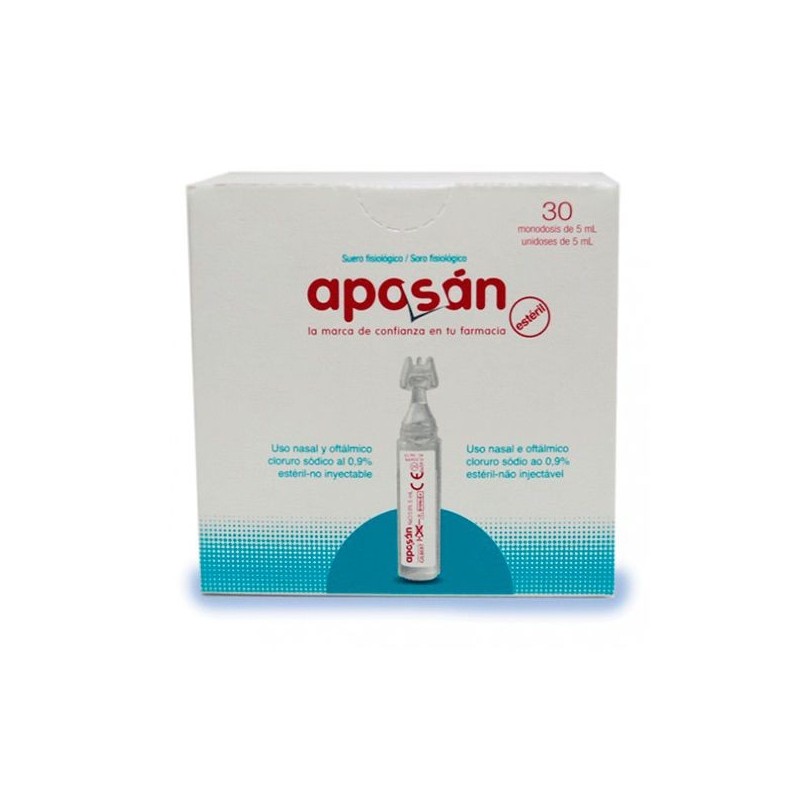 APOSÁN ES UN SUERO FISIOLÓGICO ESTÉRIL, SIN CONSERVANTES, NO INYECTABLE.PRESENTADO EN MONODOSIS. APOSÁN SUERO FISIOLÓGICO ES HIGIÉNICO Y PERMITE UNA GRAN FACILIDAD Y SEGURIDAD DE EMPLEO.MODO DE EMPLEO:PUEDE UTILIZARSE EN LACTANTES, NIÑOS Y ADULTOS.- PARA LA HIGIENE DE LA NARIZ: INSTILACIÓN O LAVADO PARA NARICES SECAS U OBSTRUIDAS.- PARA LA HIGIENE DE LOS OJOS: INSTILACIÓN, LAVADO O BAÑO.- NO UTILICE UNA MONODOSIS YA ABIERTA O DAÑADA.- NO UTILICE TRAS LA FECHA LÍMITE DE USO INDICADA EN EL ACONDICIONAMIENTO.