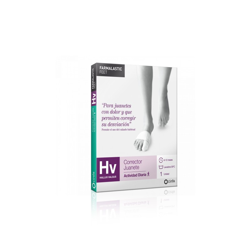 AYUDA A CORREGIR Y LIMITAR LA EVOLUCIÓN EL JUANTE (HALLUX VALGUS) Y CONTRIBUYE A ALIVIAR LOS DOLORES ARTICULARES RELACIONADOS Y LOS OCASIONADOS POR EL ROCE. EL CORRECTOR DE JUANETE, PATENTADO A DIFERENCIA DE LOS CORRECTORES RÍGIDOS, SE UTILIZA DURANTE LA JORNADA GRACIAS A SU DISEÑO FLEXIBLE Y ULTRA-FINO. REALINEA EL 1ER DEDO DEL PIE CON FORMA REGULABLE Y TAMBIÉN EL 1ER METATARSIANO, A LA VEZ QUE AYUDA A ALIVIAR EL DOLOR, TANTO ARTICULAR COMO POR ROCE. LLEVÁNDOLO A DIARIO CON CUALQUIER TIPO DE CALZADO, NO SÓLO CORRIGE Y AYUDA A ALIVIAR EL DOLOR, TAMBIÉN LIMITA LA PROGRESIÓN DEL JUANETE. SILICONA 58%, POLIAMIDA/ELASTANO 42%. PRODUCTO SANITARIO. CLASE I.MODO DE EMPLEOESTE PRODUCTO ES PARA USO DIURNO, ACTÚA DINÁMICAMENTE DURANTE LA MARCHA Y ES EFICAZ CUANDO SE UTILIZA DE FORMA CONTINUADA. PUEDE UTILIZARSE INDISTINTAMENTE EN EL PIE DERECHO O IZQUIERDO. PASAR EL EMPEINE POR LA BANDA. ENCAPUCHAR EL PRIMER DEDO, QUE LA PASTILLA DE SILICONA MÁS GRUESA QUEDE DETRÁS DEL JUANETE. AJUSTAR LA TENSIÓN SOBRE EL DEDO TIRANDO CON SUAVIDAD DE LA BANDA HACIA EL TOBILLO, EL 1ER DÍA TENSIONAR POCO Y AUMENTAR HASTA LLEGAR AL MÁXIMO A LOS 10 DÍAS.PRECAUCIONES Y ADVERTENCIASNO UTILIZAR SI EL 1ER DEDO DEL PIE YA NO PUEDE MOVERSE LATERALMENTE. NO UTILIZAR EN CASO DE PRESENTAR ALERGIA A ALGUNO DE LOS MATERIALES QUE LA COMPONEN NI SOBRE HERIDAS ABIERTAS. EN PERSONAS QUE PADEZCAN DIABETES, ARTERITIS, POLINEURITIS, NEUROPATÍA DE LOS MIEMBROS INFERIORES O ÚLCERAS VARICOSAS, CONSULTAR CON SU MÉDICO Y VIGILAR DURANTE LA UTILIZACIÓN.CONSERVACIÓN Y CADUCIDADLAVAR A MANO SIN FROTAR O A MÁQUINA (MÁX. 30º) UTILIZANDO LA BOLSA DE LAVADO ADJUNTA. AL SECAR NO EXPONER AL SOL, RADIADORES NI CUALQUIER OTRA FUENTE DE CALOR. NO PLANCHAR. EL CONTACTO DE LA PRENDA CON CREMAS O ACEITES DETERIORA LAS FIBRAS HACIÉNDOLAS MENOS ELÁSTICAS Y MÁS DÉBILES.