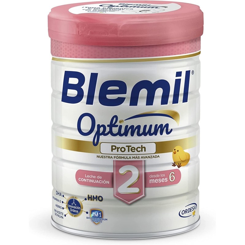 BLEMIL PLUS 2 OPTIMUM:LECHE DE CONTINUACIÓN.INGREDIENTES LACTOSA, LECHE DESNATADA, GRASA LÁCTEA, MALTODEXTRINA, ACEITES VEGETALES (ACEITE DE GIRASOL, ACEITE DE NABINA, ACEITE DE GIRASOL ALTO OLÉICO), GALACTOOLIGOSACÁRIDOS, PROTEÍNAS SÉRICAS, SALES MINERALES (FOSFATO MONOCÁLCICO, CITRATO TRIPOTÁSICO, CITRATO TRISÓDICO, CLORURO CÁLCICO, HIDRÓXIDO POTÁSICO, CITRATO DE MAGNESIO, HIDRÓXIDO CÁLCICO, BISGLICINATO DE HIERRO, SULFATO DE CINC, SULFATO DE COBRE, SULFATO DE MANGANESO, YODURO POTÁSICO, SELENITO SÓDICO), INULINA, 2 FUCOSILLACTOSA (2'-FL), ACEITE DE PESCADO (FUENTE DE DHA) (0,6%), CLORURO DE COLINA, VITAMINAS (VITAMINA C, VITAMINA E, NICOTINAMIDA, PANTOTENATO CÁLCICO, VITAMINA B2, VITAMINA B1, VITAMINA B6, VITAMINA A, ÁCIDO FÓLICO, VITAMINA K, BIOTINA, VITAMINA D, VITAMINA B12), INOSITOL, EMULGENTE (LECITINA DE SOJA), TAURINA, NUCLEÓTIDOS (5'-MONOFOSFATO DE CITIDINA DISÓDICO, 5'-MONOFOSFATO DE URIDINA DISÓDICO, 5'-MONOFOSFATO DE ADENOSINA DISÓDICO, 5'-MONOFOSFATO DE INOSINA DISÓDICO, 5'- MONOFOSFATO DE GUANOSINA DISÓDICO), BIFIDOBACTERIAS Y LACTOBACILOS (B. INFANTIS IM1, L. RHAMNOSUS) 1X109 UFC/100G, L-FENILALANINA, ANTIOXIDANTES (PALMITATO DE ASCORBILO, MEZCLA DE TOCOFEROLES), L-CARNITINA, ÁCIDO CÍTRICO. VITAMINAS, MINERALES Y AMINOACIDOS POR 100G: VITAMINAS: VITAMINA A: (RETINOL) 450 MCG VITAMINA D3: (COLECALCIFEROL) 10,5 MCG VITAMINA E: (TOCOFEROL) 15 MG VITAMINA C: (ÁCIDO ASCÓRBICO) 70 MG VITAMINA B1: (TIAMINA) 550 MG VITAMINA B2: (RIBOFLAVINA) 700 MG VITAMINA B3: (NIACINA) 3,4 MG VITAMINA B5 ( ÄCIDO PANTOTÉNICO) 3,5 MG VITAMINA B6: (PIRIDOXINA) 390 MG VITAMINA B9: (ÁCIDO FÓLICO) 125 MCG VITAMINA B12: (CIANOCOBALAMINA) 1 MCG BIOTINA: 15 MCG VITAMINA K: 35 MCG MINERALES: SODIO: 230 MG CALCIO: 615 MG FÓSFORO: 415 MG HIERRO: 9,5 MG POTASIO: 660 MG MAGNESIO: 50 MG COBRE: 390 MCG ZINC: 4 MG MANGANESO: 100 MCG, IODO: 100 MCG CLORO: 440 MG SELENIO: 20 MCG FLÚOR: 275 MCG OTROS: INOSITOL: 100 MG L-CARNITINA: 9 MG TAURINA:35 MG COLINA: 150 MG MODO DE EMPLEO PREPARACIÓN DEL BIBERÓN: 1) LÁVARSE LAS MANOS ANTES DE PREPARAR EL BIBERÓN. 2) UNA VEZ LIMPIOS EL BIBERÓN, LA TETINA Y LA ROSCA DÉJALOS HERVIR CON AGUA EN UN RECIPIENTE CERRADO DURANTE 10 MINUTOS. 3) EN OTRO RECIPIENTE HERVIR AGUA POTABLE Y DÉJARLA ENFRIAR HASTA UNA TEMPERATURA DE 40 Ó 45 °C. VERTER LA CANTIDAD ADECUADA DE AGUA EN EL BIBERÓN ESTERILIZADO. 4) AÑADIR AL BIBERÓN LAS MEDIDAS RASAS DE LECHE EN POLVO INDICADAS EN LA TABLA DE DOSIFICACIÓN. UTILIZAR EL CACITO DOSIFICADOR QUE SE ENCUENTRA EN EL INTERIOR DEL ENVASE. 5) CERRAR EL BIBERÓN Y AGÍTALO HASTA LA TOTAL DISOLUCIÓN DE SU CONTENIDO. 6) COMPROBAR LA TEMPERATURA DEL BIBERÓN ANTES DE DÁRSELO AL BEBÉ.