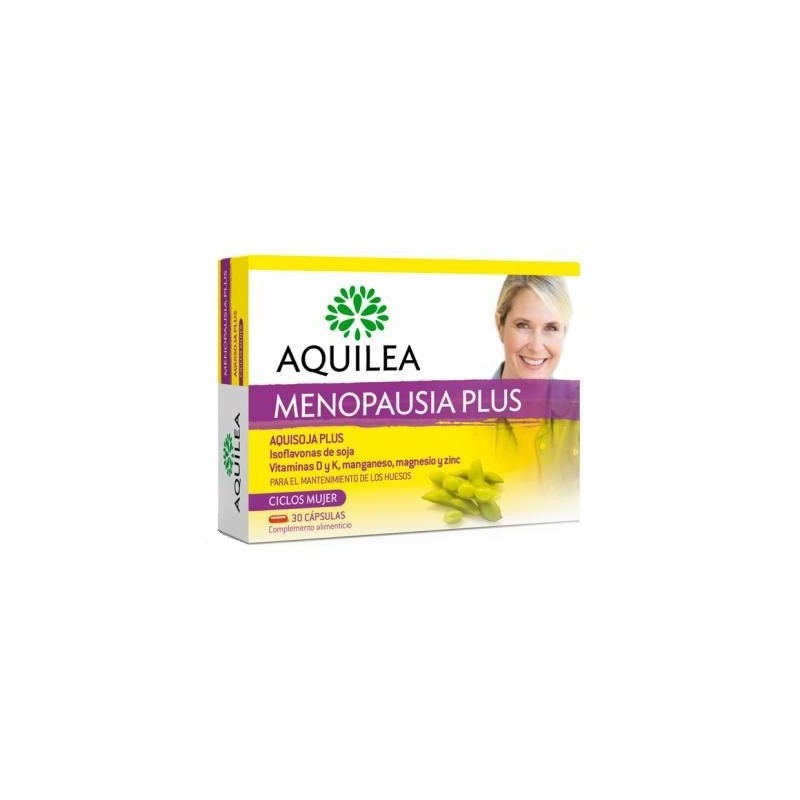 AQUILEA MENOPAUSIA PLUS:- REGENERACIÓN NORMAL DE LOS HUESOS.- CONTRIBUYE AL PROCESO DE COAGULACIÓN SANGUÍNEA.- CONTRIBUYE AL MANTENIMIENTO DE LOS HUESOS EN CONDICIONES NORMALES.- PARA MUJERES EN LA MENOPAUSIA.- SIN AZÚCAR AÑADIDO.INGREDIENTES ACTIVOS POR CÁPSULA: ISOFLAVONAS DE SOJA (72 MG), MAGNESIO (56,25 MG), ZINC (10 MG), MANGANESO (2 MG), COBRE (1 MG), VITAMINA K (75 ΜG), MOLIDDENO (50 ΜG), VITAMINA D (5 ΜG).LOS COMPLEMENTOS ALIMENTICIOS NO DEBEN UTILIZARSE COMO SUSTITUTOS DE UNA DIETA VARIADA Y EQUILIBRADA Y DE UN MODO DE VIDA SANO. NO SOBREPASAR LA CANTIDAD DIARIA RECOMENDADA. CONSERVAR EN LUGAR FRESCO Y SECO, PROTEGIDO DE LA LUZ SOLAR. MANTENER FUERA DEL ALCANCE DE LOS NIÑOS.