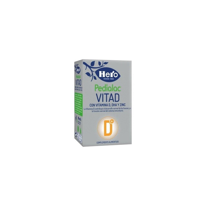 HERO PEDIALAC VITAD ES UN COMPLEMENTO ALIMENTICIO QUE AYUDA A MANTENER LOS NIVELES RECOMENDADOS DE VITAMINA D. CONTRIBUYE AL DESARROLLO NORMAL DE LOS HUESOS Y A LA FUNCIÓN NORMAL DEL SISTEMA INMUNITARIO. BUENA TOLERANCIA DIGESTIVA, APTO PARA DIETA SIN GLUTEN Y LIBRES DE LACTOSA. DE FÁCIL ADMINISTRACIÓN, CON UN SABOR NEUTRO.INGREDIENTESTRIGLICÉRIDOS DE CADENA MEDIA (ORIGEN COCO), ACEITE DE MICROALGAS SCHIZOCHYTRIUM SP, ÓXIDO DE ZINC, VITAMINA D (COLECALCIFEROL)DOSIS DIARIA: TOMAR 0,5 ML UNA VEZ AL DÍA. NO SUPERAR LA DOSIS DIARIA RECOMENDADA.AGITAR SIEMPRE ANTES DE CADA USO. UNA VEZ ABIERTO, CERRAR EL FRASCO INMEDIATAMENTE, CONSERVAR EN EL FRIGORÍFICO Y CONSUMIR EN UN PLAZO MÁXIMO DE 30 DÍAS. CONSERVAR EN LUGAR FRESCO Y SECO, POR DEBAJO DE 25ºC, ALEJADO DE FUENTES DE CALOR.ADVERTENCIAS: CONSULTE LA OPINIÓN DEL PROFESIONAL DE LA SALUD ANTES DE UTILIZAR ESTE PRODUCTO. NO SUPERAR LA DOSIS DIARIA RECOMENDADA. LOS COMPLEMENTOS ALIMENTICIOS NO DEBEN UTILIZARSE COMO SUSTITUTO DE UNA DIETA EQUILIBRADA O DE UN ESTILO DE VIDA SALUDABLE. MANTENER FUERA DEL ALCANCE DE LOS NIÑOS.UN EXCESO DE VITAMINA D PUEDE TENER CONSECUENCIAS MUY GRAVES SOBRE SU SALUD (HIPERCALCEMIA GRAVE). DAR DEMASIADA VITAMINA D PUEDE SER TAN PELIGROSO COMO NO DAR SUFICIENTE.SINSIN GLUTEN, SIN HUEVO, SIN LACTOSA.