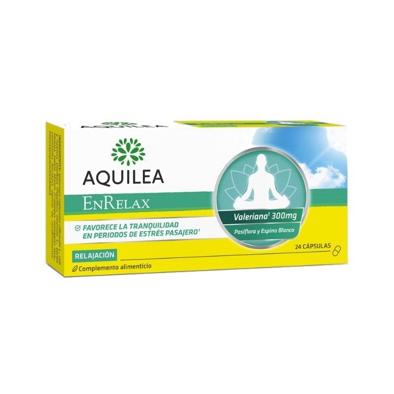 GRACIAS A SU FÓRMULA CON EXTRACTOS NATURALES FAVORECE LA TRANQUILIDAD Y LA CALMA EN PERIODOS DE ESTRÉS PASAJERO. EL ESTRÉS PASAJERO SE PUEDE PADECER DURANTE UN PERIODO DE TIEMPO MÁS PROLONGADO Y ESTÁ OCASIONADO POR SITUACIONES DIARIAS RELACIONADAS CON EL TRABAJO, LA FAMILIA Y OTRAS RESPONSABILIDADES.AQUILEA ENRELAX FACILITA LA RELAJACIÓN, GRACIAS A LA COMBINACIÓN DE SUS INGREDIENTES ACTIVOS COMO VALERIANA, PASIFLORA Y ESPINO BLANCO.LA VALERIANA: ES LA PLANTA IDEAL PARA TODA PERSONA SOMETIDA A PERIODOS DE ESTRÉS.PASIFLORA: LA PASIFLORA ES UNA DE LAS PLANTAS MÁS UTILIZADAS PARA MANTENER LA ACTIVIDAD MENTAL DURANTE PERIODOS DE ESTRÉS.ESPINO BLANCO: ES LA PLANTA IDEAL PARA TODA PERSONA SOMETIDA A PERIODOS DE ESTRÉS Y RITMOS DE VIDA ACELERADO, YA QUE AYUDA A TRANQUILIZAR.COMPOSICIÓNPOR 1 CAPSÚLA: VALERIANA (100 MG), PASIFLORA (100 MG), ESPINO BLANCO ( 100 MG).LOS COMPLEMENTOS ALIMENTICIOS NO DEBEN UTILIZARSE COMO SUSTITUTOS DE UNA DIETA VARIADA Y EQUILIBRADA Y DE UN MODO DE VIDA SANO. NO SOBREPASAR LA CANTIDAD DIARIA RECOMENDADA. CONSERVAR EN UN LUGAR FRESCO Y SECO, PROTEGIDO DE LA LUZ SOLAR. MANTENER FUERA DEL ALCANCE DE LOS NIÑOS MÁS PEQUEÑOS. NO ADMINISTRAR A NIÑOS MENORES DE 12 AÑOS.